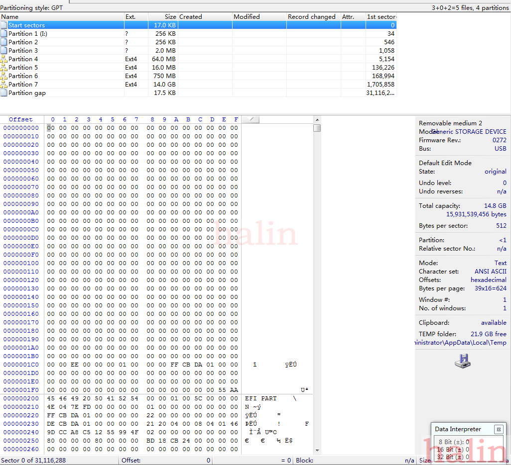 正好与win7中用winHex打开,看到的4个Ext4格式的分区对应,