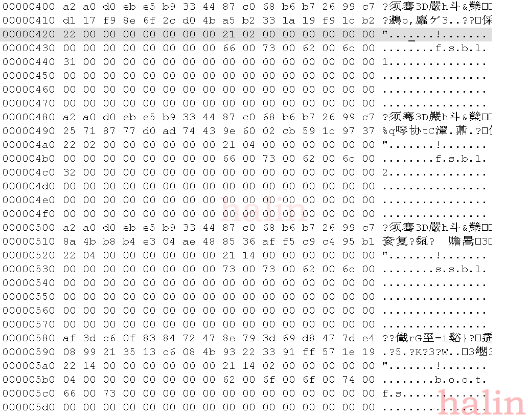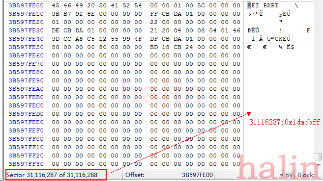 8字节地址,GPT Header备份所在LBA,这里是0x1dacbff,下图是WinHex中的第0x1dacbff扇区的数据:
